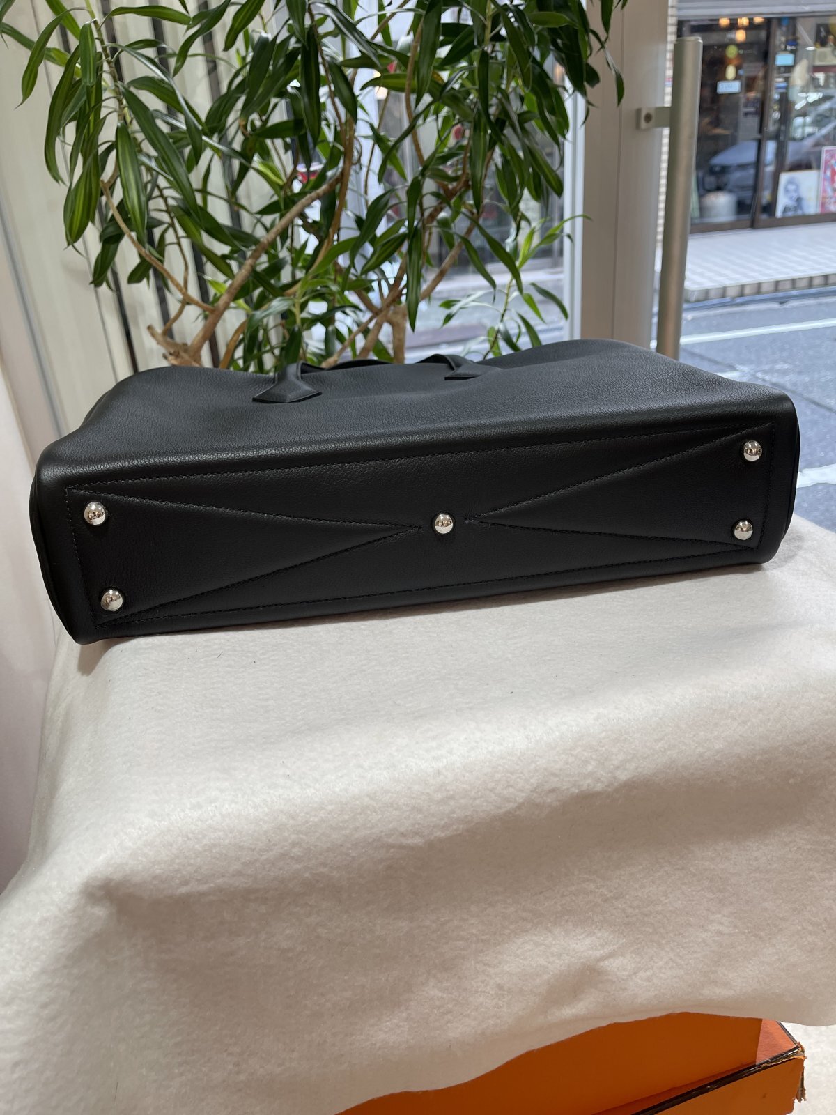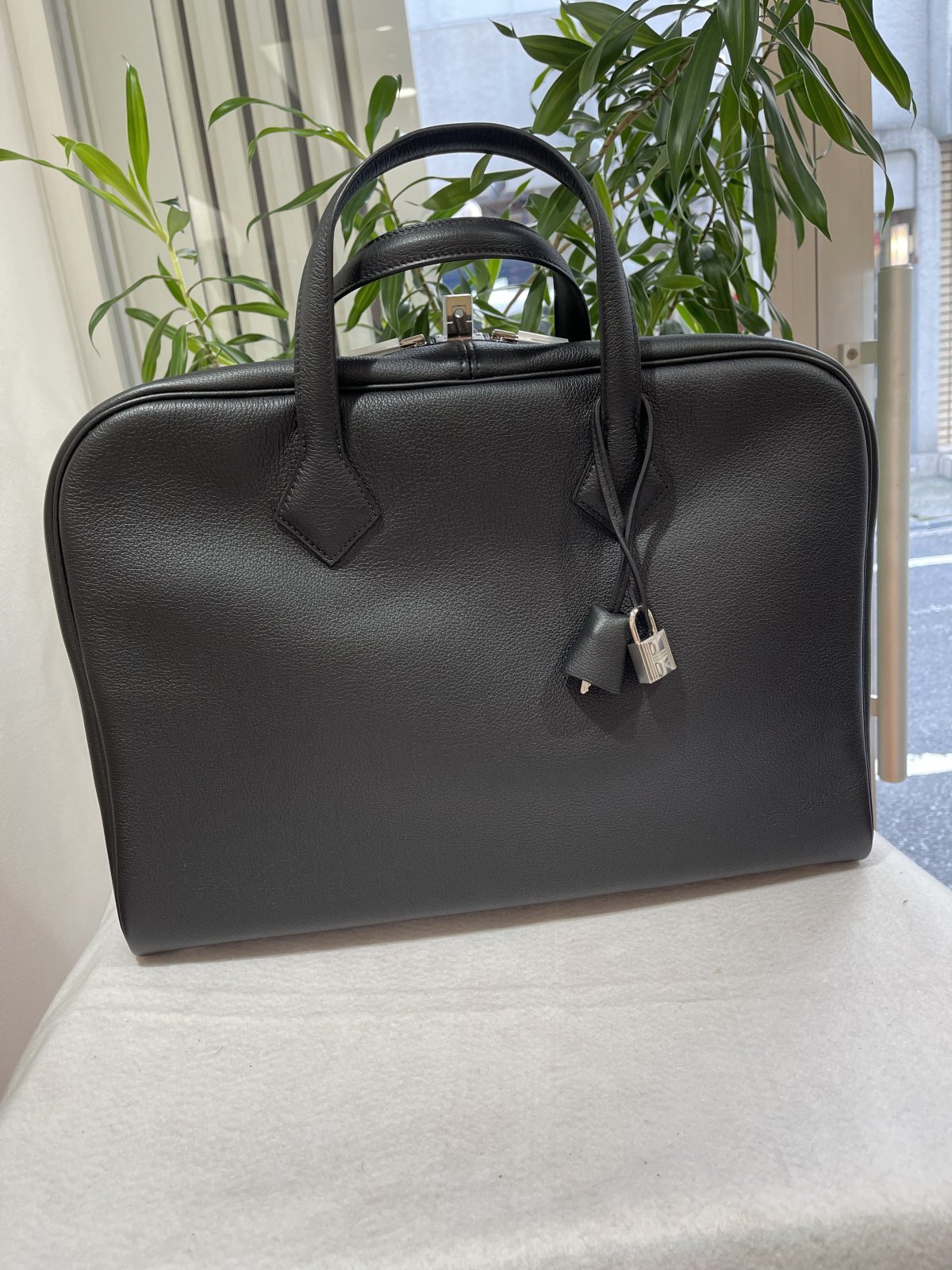 HERMES・ビジネスバッグ「ヴィクトリア 2 12H 40」です。トリヨンノビーヨ素材・カラーはブラック・シルバー金具・T刻印(2015年製造)になります。スリムになってリニューアルされたニューモデル・ヴィクトリア 2 12H 40が入荷致しました。ユニセックスにお使いいただける大人気アイテムです。こちらは新品・未使用品になりますので、自分へのご褒美・大切な人へのプレゼントにいかがでしょうか。展示小傷、うっすらとした展示汚れ程度はご了承下さいませ。金具・カデナには保護シールが残っております。箱(ダメージ有り)・保存袋・クロシェット・鍵2本・ジャポンタグ・ショップカードが付属しております。詳細につきましては、お気軽にお問い合せ下さいませ。
