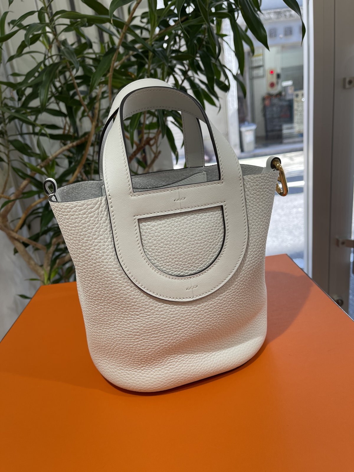 HERMES・ハンドバッグ「インザループ 18」です。トリヨンクレマンス×スイフト素材・カラーはニューホワイト・ゴールド金具・B刻印(2023年製造)になります。ハンドル・底面・金具部分にシェーヌダンクルモチーフをあしらった高級感たっぷりなアイテム!デイリーユースにお薦めなハンドバッグです。こちらは新品・未使用品になりますので、自分へのご褒美・大切な人へのプレゼントにいかがでしょうか。展示小傷、うっすらとした展示汚れ程度はご了承下さいませ。箱・保存袋が付属しております。詳細につきましては、お気軽にお問い合せ下さいませ。