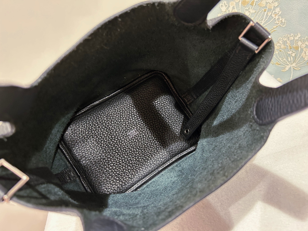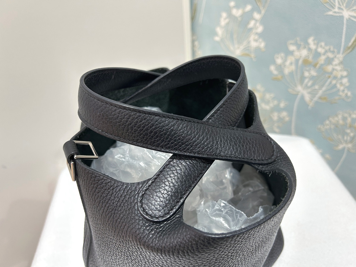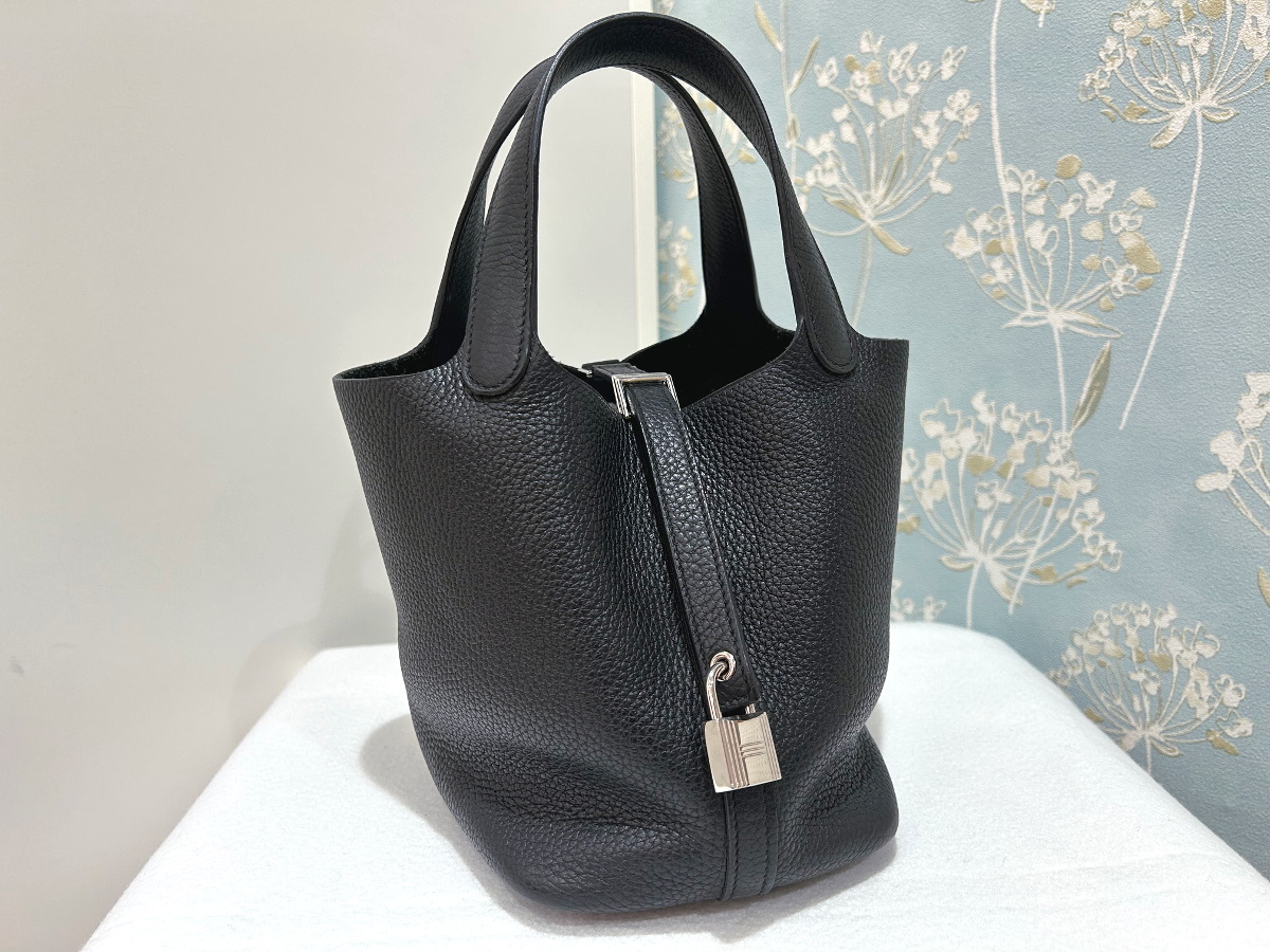 HERMES・ハンドバッグ「ピコタンロック 18 PM」です。トリヨンクレマンス素材・カラーはブラック・シルバ金具・D刻印(2019年製造)になります。洗練された女性の永遠の憧れ。究極のデイリーバッグ「ピコタンロック」エルメスのバッグの中でも、圧倒的な支持を集める「ピコタンロック」。その中でも、オンオフ問わず気品を放つ一番人気の18(PM)サイズ、カラーは不動の王道**「ノワール(ブラック)」**が入荷いたしました。 贅沢な素材感: しっとりと手に馴染む、最高級レザー「トリヨンクレマンス」を使用。使い込むほどに風合いが増し、一生モノのパートナーに。洗練されたデザイン: 荷物をさっと出し入れできるバケツ型のフォルムに、アイコニックなカデナ(南京錠)がキラリと輝き、クラス感を高めます。圧倒的な使いやすさ: コンパクトながら見た目以上の収納力。デニムスタイルから特別な日のドレスアップまで、これ一つで装いが完成します。現在、エルメス直営店でも入手が極めて困難な逸品です。自分へのご褒美に、「本物」を手にしてみませんか?ユーズド品の為、四隅・ハンドルにうっすらとしたスレ、金具の小傷、表面・内部にもうっすらとしたスレ・汚れ・毛羽立ち程度は見受けられますが、使用感も少なくコンディションは良好です。カデナ・鍵1本が付属しております。詳細につきましては、お気軽にお問い合せ下さいませ。